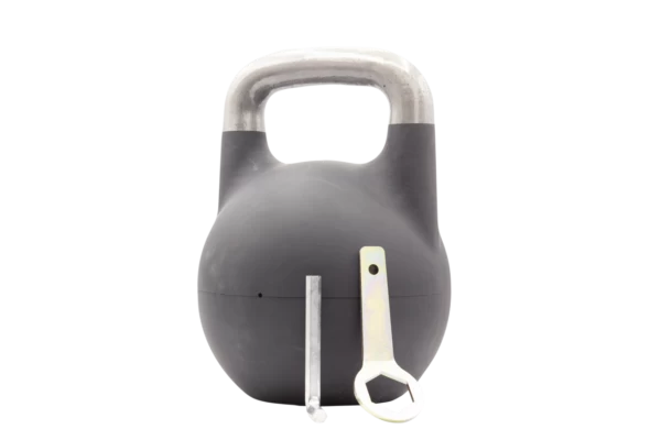 This steel competition style kettlebell has an 12 kilogram shell made of steel, inside it has seven cast iron plates weighing 2,2,2,3,3,4 and 4 kilograms. The plates are screwed in (as displayed in images) and secured with a bolt so there is no movement during kettlebell movements. You can add or remove as many plates as you need to adjust the weight for specific workouts. When all plates are inside the kettlebell it weighs 32 kilograms total. With this combination of plates you can adjust the kettlebell to weigh any weight between 8 and 32 in one kilogram increments. Do not worry about any kind of movement or rattle, the plates and the base are screwed in tightly and the kettlebell comes witih the tools.