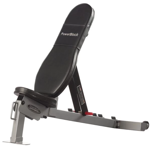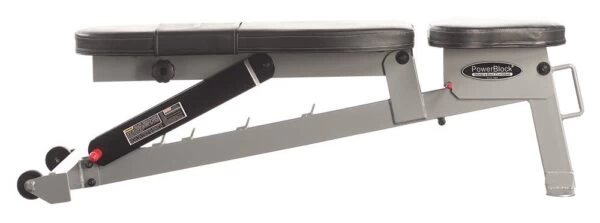 This PowerBlock Sport Weight Bench adjusts to five positions, including military, flat, and varying degrees. This weight bench is built durable of heavy-gauge steel and holds up 550 pounds. It sports a padded top with easy-clean black vinyl. Additional Information:Adjustments: flat, military, 30-, 45-, and 60-degree Built-in wheels for easy mobility Built-in handle 16-in. from pad to floor in flat position Flat position: 50L in. 21-in. at widest part of back leg Dimensions: 50L x 21W x 16H in.. 14-gauge 2ร3 steel tubing. Padded top with black vinyl. Weight capacity: 550 lbs.. 5-position adjust.